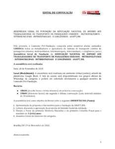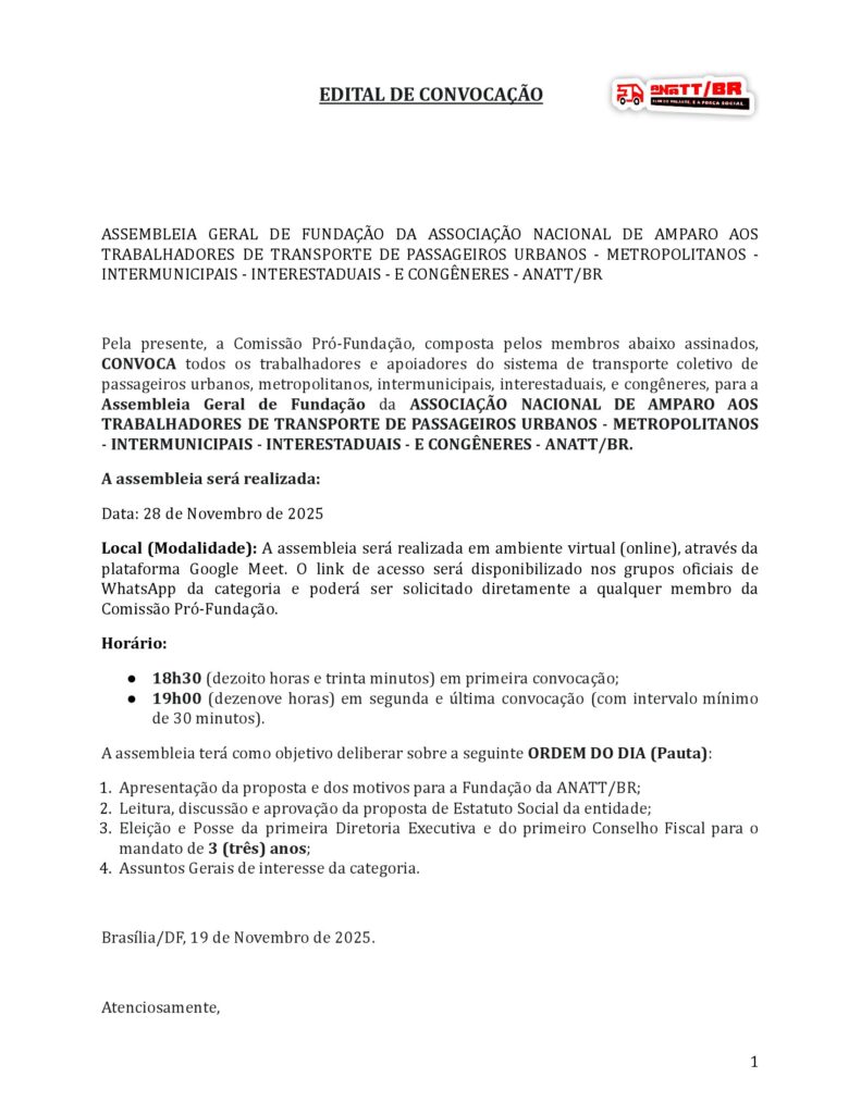 Chegou o momento que esperávamos. Cansados de não ter voz ativa e de ver nossas demandas ignoradas, tomamos a decisão de nos unir. Nesta sexta-feira, daremos o passo mais importante da nossa história recente: a Fundação Oficial da ANATT/BR (Associação Nacional de Amparo aos Trabalhadores de Transporte de Passageiros Urbanos, Metropolitanos, Intermunicipais, Interestaduais e Congêneres).